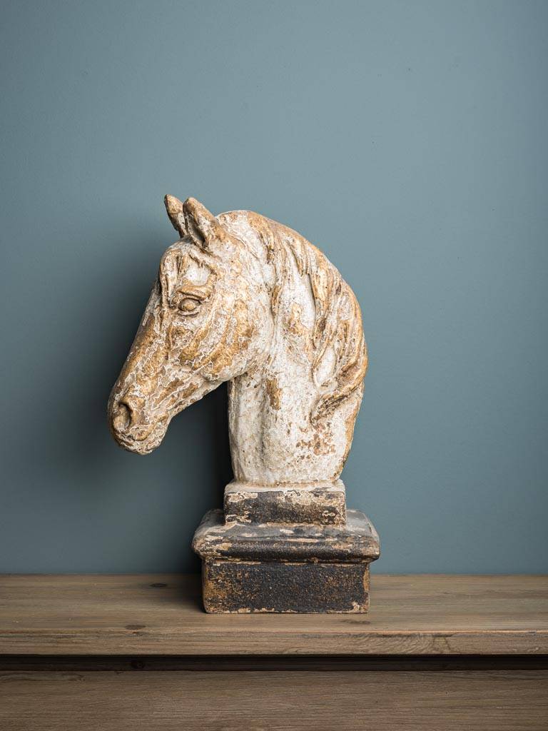 Sur commande : La sculpture en grès d'une tête de cheval présente une patine vieil or, lui conférant une élégance et un charme intemporels.